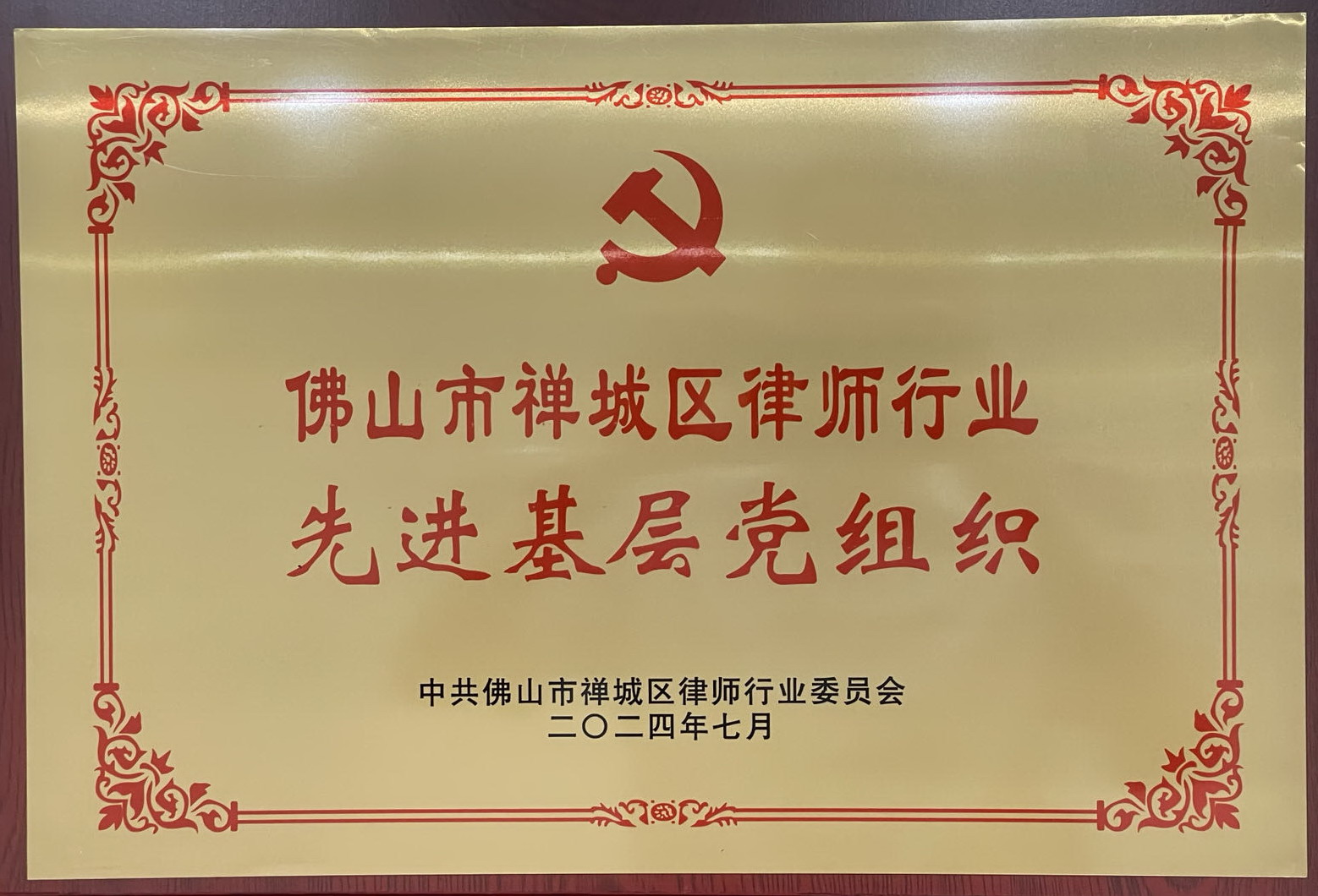 2024年7月,荣获中共佛山市禅城区律师行业委员会“佛山市禅城区律师行业先进基层党组织”荣誉称号
