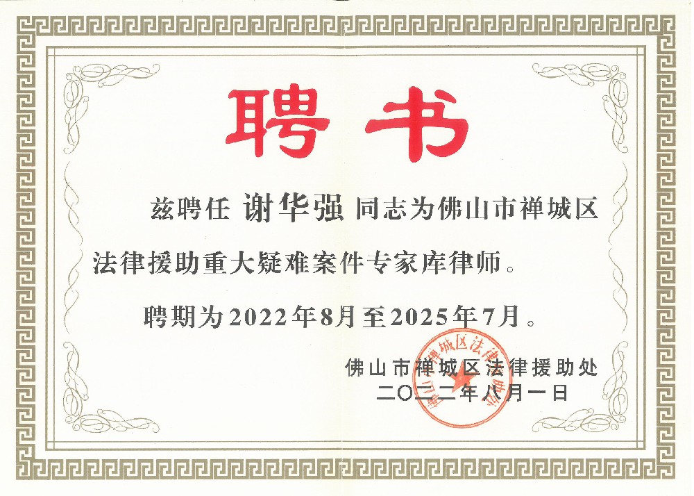 喜报 | 恭喜我所谢华强律师受聘为佛山市禅城区法律援助重大疑难案件专家库律师