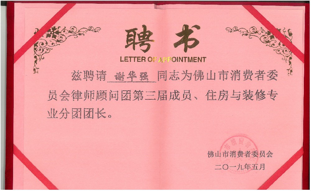 谢华强律师受聘为佛山市消费者委员会第三届律师专家顾问团成员、住房与装修专业分团团长